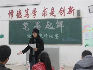 七点的钟声敲响,在主持人为参赛者介绍了到场的评委,宣布了比赛规则和相关细节后,伴随着台下观众热烈的掌声,比赛正式开始。在比赛中,每个人都充满激情,斗志昂扬,他们站在舞台中央,用自己的方式诠释着属于自己的经历,将自己的心情释放的淋漓尽致。“笔墨起舞”在学生们的阐述中变得精彩纷呈,他们回顾自己的读书经历,回忆自己的那段青春时光,却又不乏对未来的美好憧憬。 有的人欣赏《鲁宾逊漂流记》 ,为主人公鲁宾逊的毅力而感动;有的人拜读《白雪公主》 ,为白雪公主的纯洁而欢呼;有的人浏览《园丁与主人》 ,为园丁拉森的聪明而自豪。更从《水浒传》中,结识了忠义宽容的宋江;在《三国演义》里,认识了足智多谋的诸葛亮;在《钢铁是怎样炼成的》里,吸取了战胜困难的力量。各式各样的书籍让他们看到了另一个独特的世界,为学生们打开了另一扇通往明天的亮窗。在一个又一个的五分钟里,一个又一个的梦想飘扬在教室上空,弥漫着奋斗的气息,是花就要开在花开处,是草就该绿在草绿时,每个人的江山都依仗自己的奋斗才打的来。在参赛者激情澎湃的演讲中,每个人的生活态度,人生的理想,宏伟的蓝图,以及每个人的性格都刻画的栩栩如生。“笔墨起舞”活动初赛在学生们精彩的演讲中圆满结束,我系于兴涛,韩丽娟顺利进入复赛。