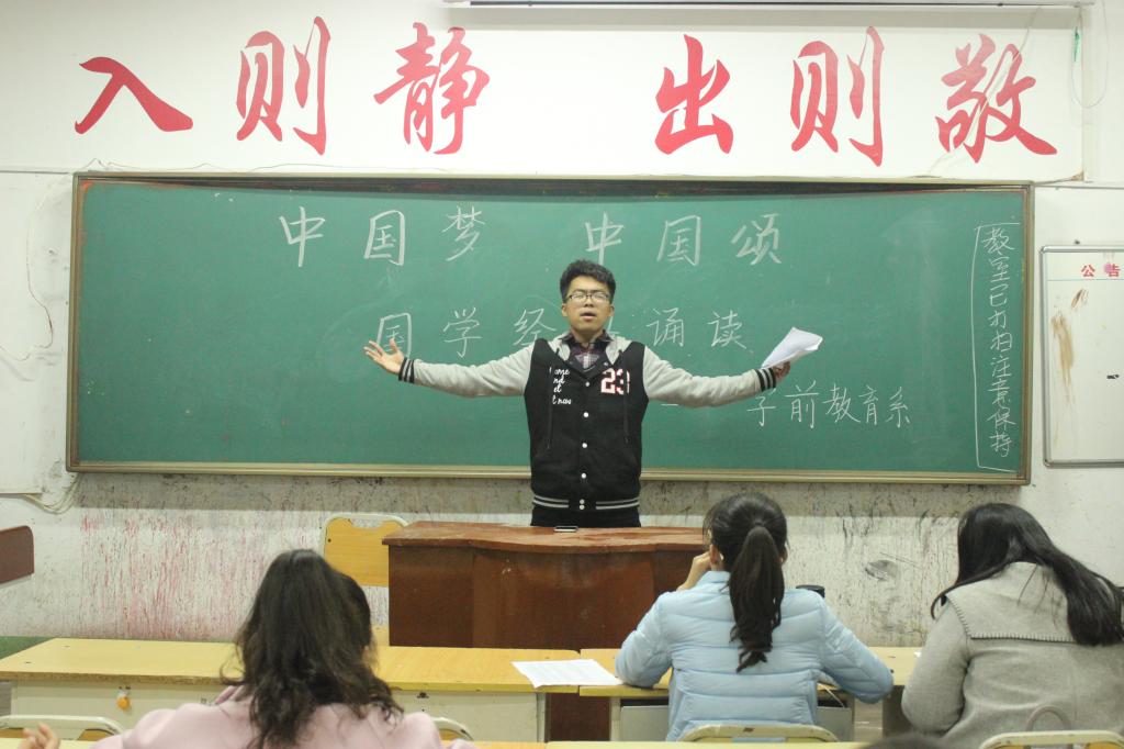 为增强学生的爱国情怀,向国学经典致敬。11月15日,计算机与信息工程系杨荣、李悦、程都等十名学生在文科楼103教室参加由学前教育系主办的“中国梦 中国颂 国学经典诵读”初赛。