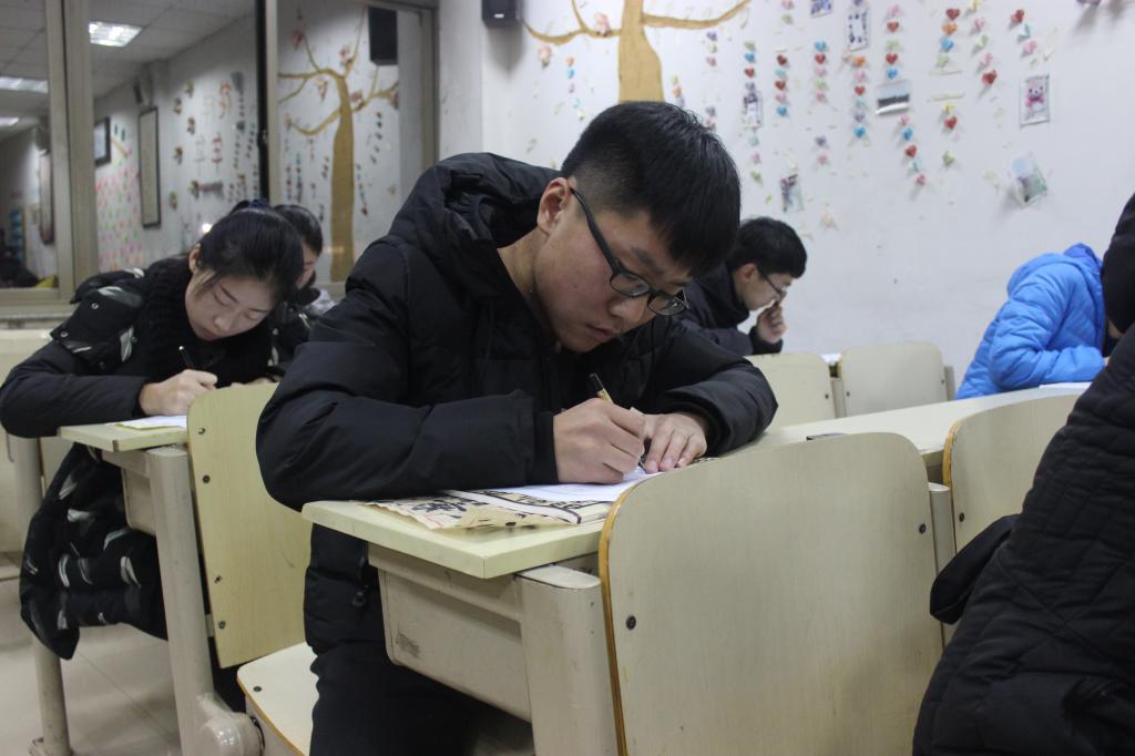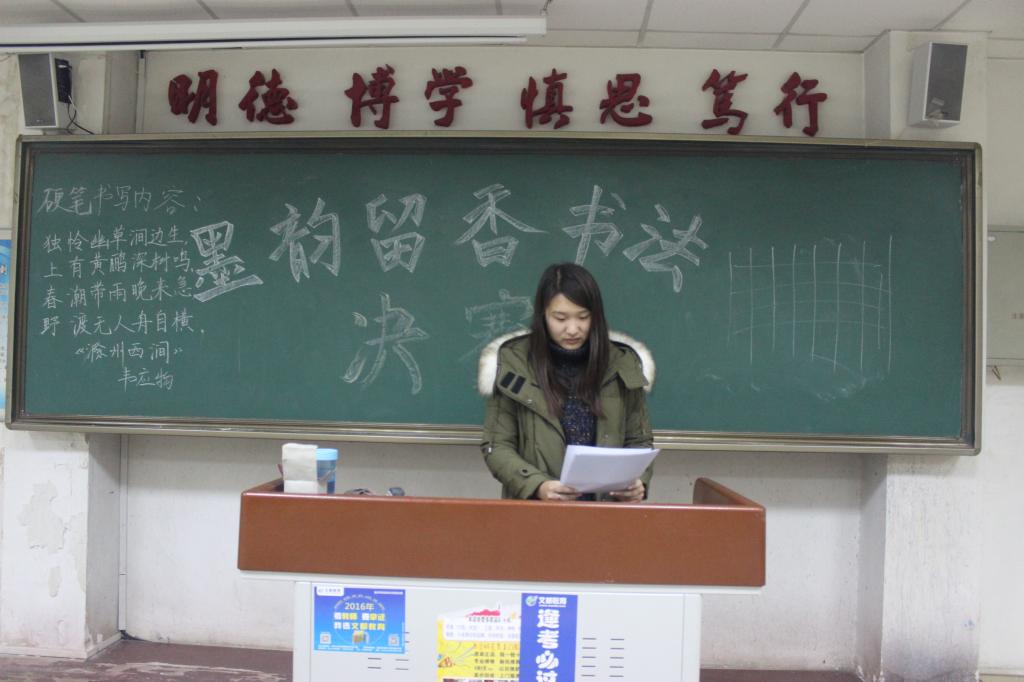 晚上7点10分,工作人员和参赛人员纷纷提前来到现场。7点30分,比赛正式开始,工作人员开始发放比赛用纸,然后在黑板上写了一首韦应物的《滁州西涧》,“独怜幽草涧边生,上有黄鹂深树鸣,春潮带雨晚来急,野渡无人舟自横。”工作人员规定所有参赛人员一律现场书写这首诗,不得临摹。计算机与信息工程系的杨茂盛在软笔组独领风骚,他写的正楷方正遒劲,有骨有肉,颇有颜真卿的风范,得到了很多工作人员和参赛人员高度的赞赏,还有不少人纷纷掏出手机进行拍照留念,表示十分的羡慕他的一手好字。计算机与信息工程系的其他比赛人员也不甘示弱,纷纷都极其认真的进行书写,当有很多参赛人员已经写完离开的时候,他们也没有受到影响,依然坚定的握住手中的笔,认真的书写,在他们炯炯有神的目光之中,看不出半点的马虎。晚上8点30分,所有的参赛人员都已经交齐作品,比赛圆满结束。