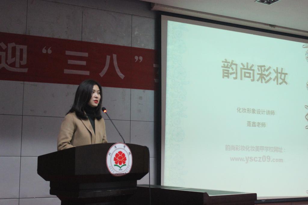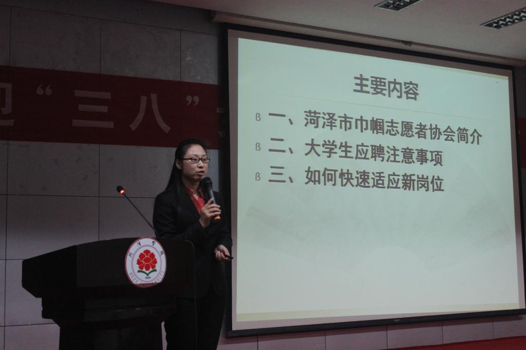 为增加女大学生进入职场的经验,3月3日,计算机与信息工程系部分学生在图书馆报告厅参加由菏泽市妇女联合会、市巾帼志愿者协会和妇委会联合主办的女大学生职场教育讲座。此次讲座的主讲人有市巾帼志愿者协会秘书长苗珊珊、化妆形象设计讲师聂鑫。