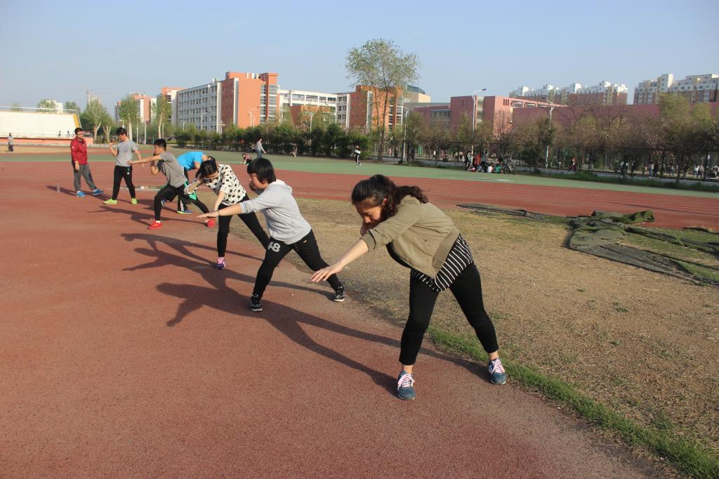 下午4点,体育部部长张月鑫、副部长王显浩一如既往地来到新田径场东操场,督促和激励运动员们的训练。运动员们热身后,所有参加径赛的运动员在杨振豪的带领下进行摆臂、腿部耐力和爆发力的训练。摆臂训练的时候,杨振豪耐心的教导运动员们摆臂的动作要领,并及时的纠正错误的摆臂方式。针对腿部的训练,则是两人一组进行拉力带的阻力训练。参加田赛的运动员们由任民昊进行规范的动作指导,铅球、标枪、铁饼等动作他都一一进行讲解和纠正,运动员们也都耐心地听他的讲解,并不断地揣摩与练习。经过一个多小时的艰苦训练,运动员们满身大汗,虽然身体很是疲惫,但是掩饰不住从训练中获得的充实的笑容。下午5点30分,训练结束。
