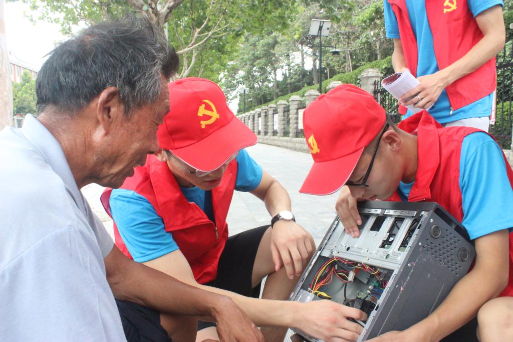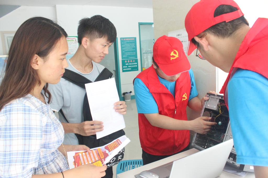 上午9点实践团队集合完毕,团队成员将维修电脑的工具准备好,接着摆好摊位。街上来来往往的人时不时驻足向前询问家中电脑出现的一些问题,团队成员也为他们一一解答。一位即将进入大学的路人向前来询问大学生应该买什么牌子的电脑比较好,团队人员为他介绍了一些关于电脑的性能、配置的问题并且为他推荐了几款电脑。摊位前的人来往不绝,很多人都在排队修电脑。一部分人也上前询问一些关于电脑平时出现的问题,比如电脑有时会突然蓝屏,或者有时候网络不稳定都如何解决。团队人员为了让路人可以回家以后也能够进行一样的操作,用路人的手机录下视频,方便路人回家以后可以对照视频维修电脑。团队成员的义务维修电脑活动受到附近居民的一致好评。