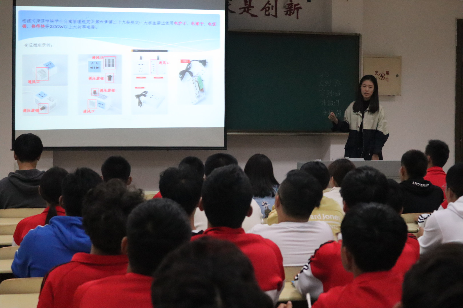 下午7点30分,宣讲开始,内容分为生活安全、用电安全、食品安全、消防安全等六部分利用图片和视频的方式详细为学生们进行讲解,首先从近期学校发生的火灾案例出发,分析了宿舍发生火灾的主要原因,告诉学生宿舍用电安全的重要性,并强调禁止使用违章电器,遵章守纪、提高安全意识是一个学生的基本素质,也是创建安全宿舍的必要条件。