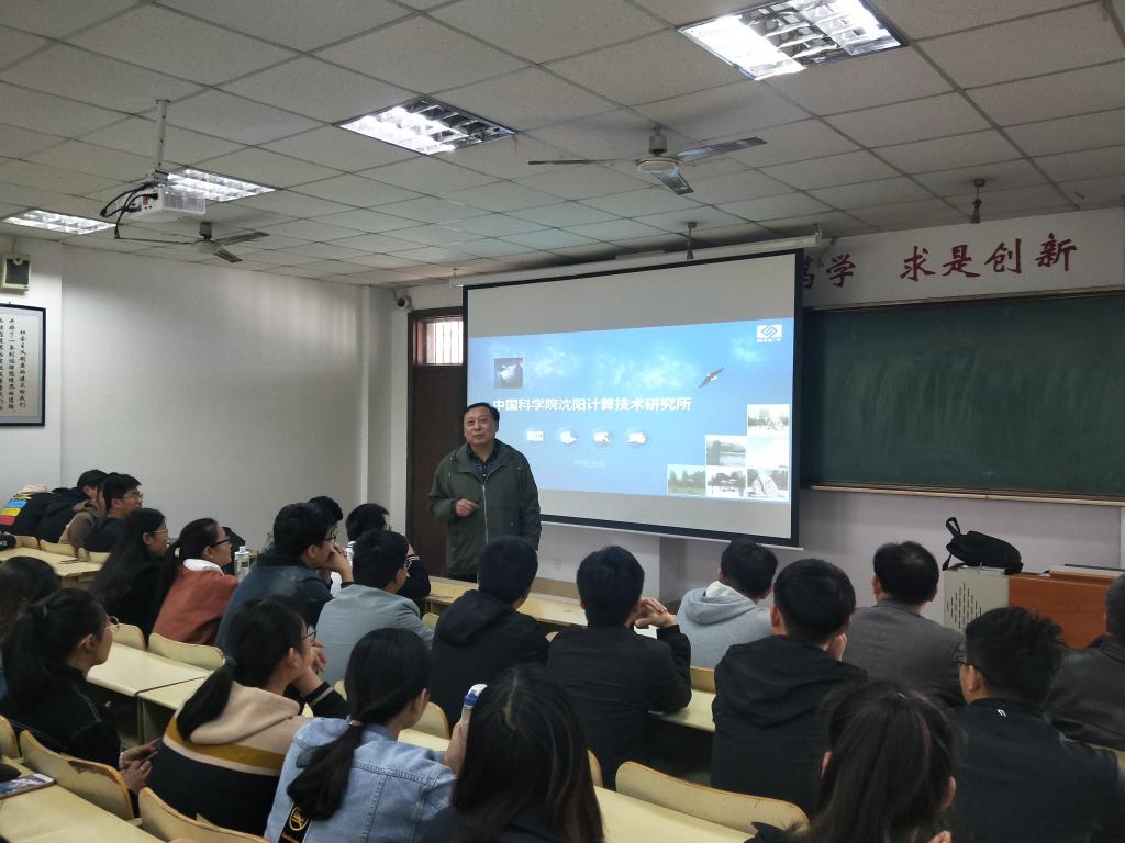 下午2点30分,宣讲会正式开始。首先由康鸿雁向在座学生介绍主讲人丁健,在台下学生的掌声中,丁健上台宣讲,他先从人员组成、占地面积、重大科技成果等方面配以照片向学生们介绍研究所,为使学生对中国科学院沈阳计算技术研究所进一步了解,他向在座学生详细讲解了研究所的研发部门、研究方向及创新平台,在PPT中,共有“系统与软件实验室”等9个研发部门,26个研发方向,研究所设有“高档数控国家工程研究中心”、“数控控制总线技术国家工程实验室”、“信息技术实验室”等多个重点实验室,为国家经济性发展和社会进步做出开拓性贡献。接着,他给学生们说明研究所学科点与招生条件等方面问题,为学生讲解研究生学位培养层次及每年招生情况,并承诺各专业均招收推荐免试应届本科生,台下学生认真观看记录。最后,丁健告诫学生们,以后无论选择哪所学校,现在应当将学习放在主位,做好当下,展望未来。