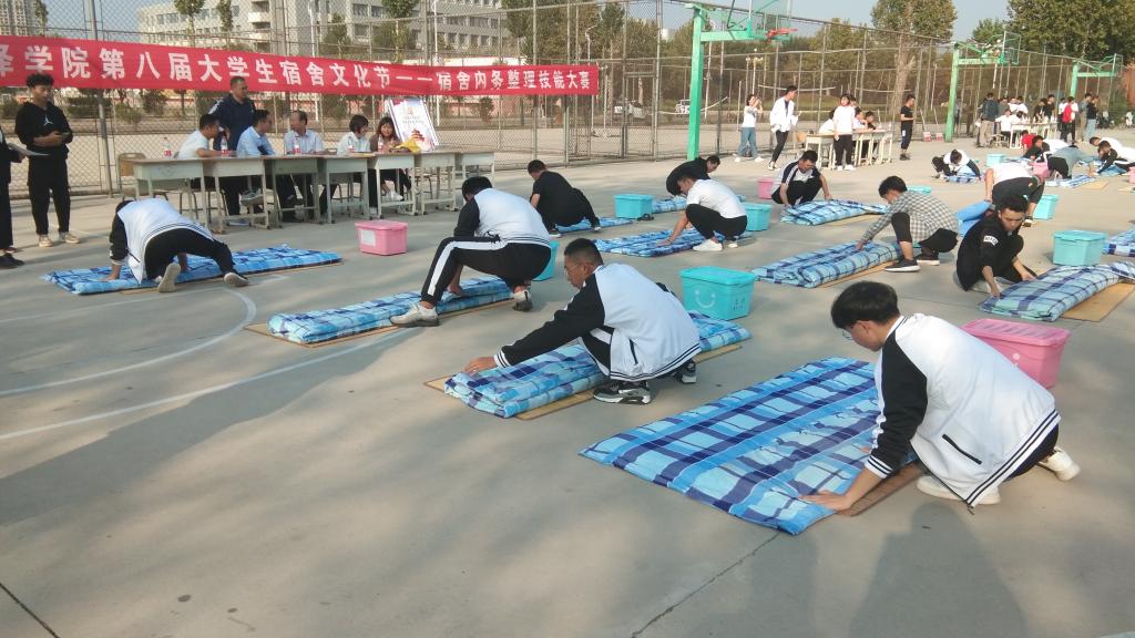 下午3点整,比赛正式开始。首先由主持人介绍比赛规则,本次比赛顺序由各院负责人随机抽取,每列6人参赛,参赛代表需按照要求在规定区域摆好凉席,并将棉被放在凉席上铺平,比赛限时3分钟,要求每个学生独立完成。随后,裁判宣布开始比赛,学生立马进入状态,迅速蹲下,熟练的叠起被子,在仅有的3分钟的比赛时间里,每个学生的被子都成了“豆腐块”,整整齐齐、方方正正、有棱有角, “时间到”,学生们立刻起立,站在自己的“作品”前,等待评委的点评、打分。在激烈的比赛中,选手个个叠法熟练,精神集中,最终男生宿舍11号楼318获得了集体二等奖,女生宿舍15号楼632获得了集体二等奖,杜萌祎获得了个人三等奖。