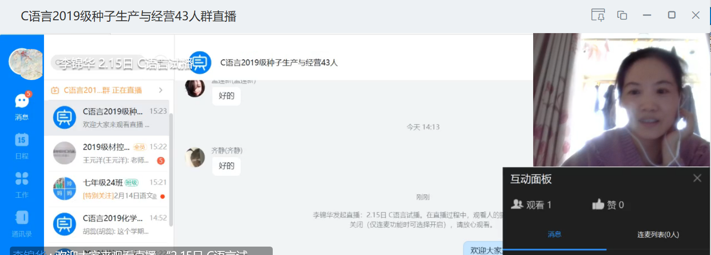 上课过程中还可以利用学习通选人的功能,用学习通选人,用钉钉直播连麦互动,这样就不是只有老师参与,把同学的积极性调动起来,但是连麦的功能在网络环境好的情况下可以使用,如果网络环境不好,连麦就可以换成在讨论区发消息和同学们随时互动。
