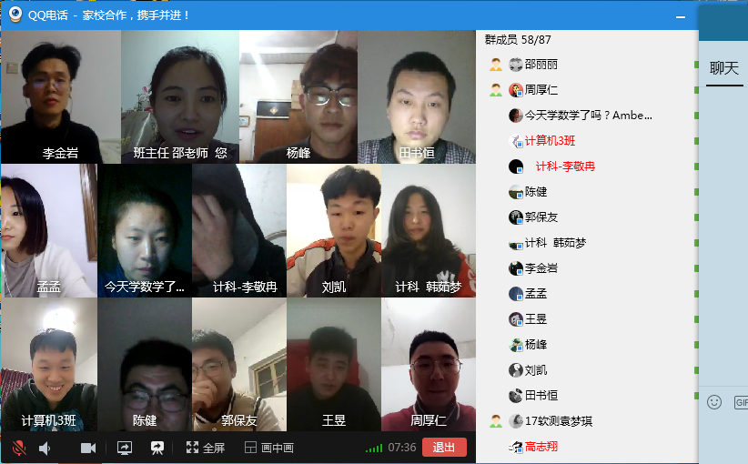 班会中受邀学生家长与班主任、学生们积极交流,家长提出了对在家学习效果的关心,表示一定尽力配合学校工作,克服困难,为同学们创造一个优异的学习环境。家长对老师们的辛勤付出与深切关怀表示感谢,并将加强监督,保障学生网课出勤及学习质量。学生家长代表贺景菊认为学生在家应合理作息,适当运动,通过读书等方式补充自己的知识,并表示配合学校安排,做好家校共育。学生代表积极响应班主任和家长要求,纷纷表示:从现在做起,合理安排作息,积极配合网课教学,提高专业素质,加强自控能力。