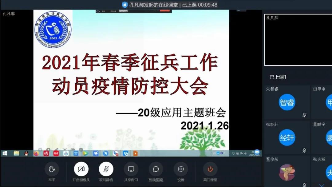 本次线上主题班会的成功召开,使学生明确了参军入伍对国家以及对个人的重要意义,鼓励对入伍感兴趣的学生及时了解相关文件,积极报名。此外,本次班会引导学生认识到防疫的重要性,确保学生安全地度过假期。