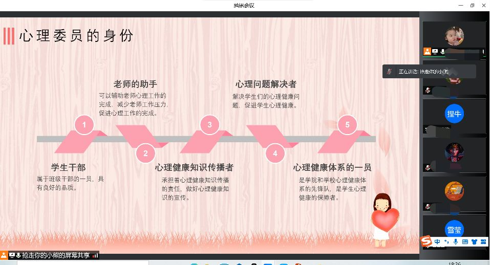 为充分发挥班级心理健康委员朋辈帮扶作用,强化班级心理健康委员责任意识,4月5日,伟德victor1946开展班级心理健康委员线上培训,各班心理健康委员参加培训。心理健康部孙雅菲主讲。