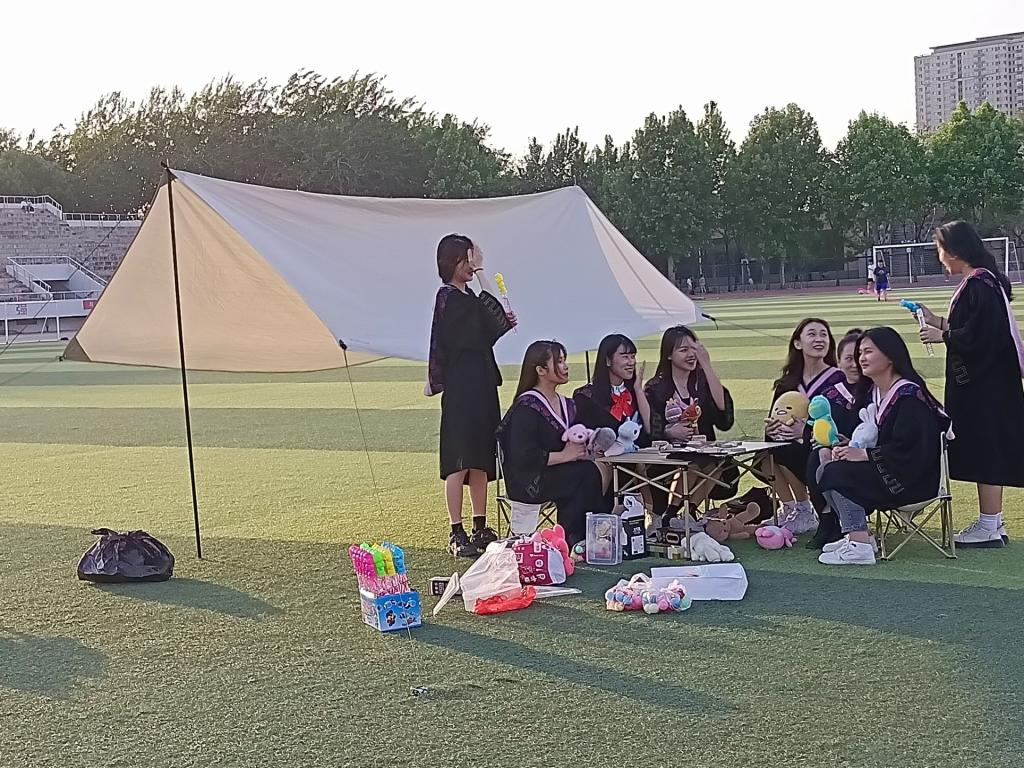 我院积极做好准备工作,搭好露营帐篷、桌子以及椅子,放好点缀小灯,播放欢快的音乐,活动正式开始。打卡地的搭建吸引了众多毕业学子。“在广袤的空间和无限的时间中,能与你们共享一颗行星和同一段时光,是我的荣幸!”即将毕业分别的大家在这温馨的气氛中拍照留念,那一刻,友谊更加深厚,爱情更加甜蜜!“露营”式的拍照打卡成为了他们毕业记忆中独特的一抹色彩。欢快的音乐很快也吸引了众多同学,大家纷纷加入到“微微一笑”活动中,拍照打卡留住自己的“最美微笑”瞬间。不知不觉活动接近尾声,大家仍沉浸在快乐之中,每一个人都意犹未尽。活动结束后我院认真清理活动垃圾,清点好活动材料和设备。