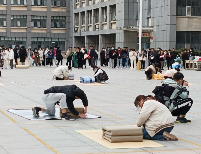 首先,由退伍军人带领女兵连代表进行内务整理展示。紧接着,叠被子比赛正式开始。各学院参赛队伍以抽签的顺序依次进场,参赛学生瞬间进入状态,在规定时间内有条不紊的将被子叠成方方正正的豆腐块状。提示时间到时,都停止整理,起身等待评委打分。接下来,宿舍模拟场景整理比赛开始。两名同学需在规定时间内配合着整理现场模拟的宿舍环境,按照宿舍管理检查标准整理,最后由评委统一评分。最后汇总两项比赛的得分,我院取得第八名的成绩。