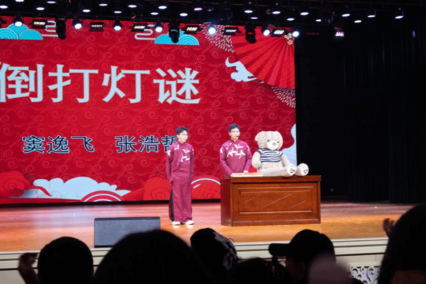 打击乐合奏环节,林瑞晨、刘前奥等六位演员用精湛的技艺为观众带来了震撼人心的打击乐表演,他们的默契配合和激情四溢的演奏,让现场观众陶醉其中。相声《倒打灯谜》由张浩哲、窦逸飞表演,他们以幽默诙谐的语言和生动的表情,赢得了观众的阵阵喝彩。