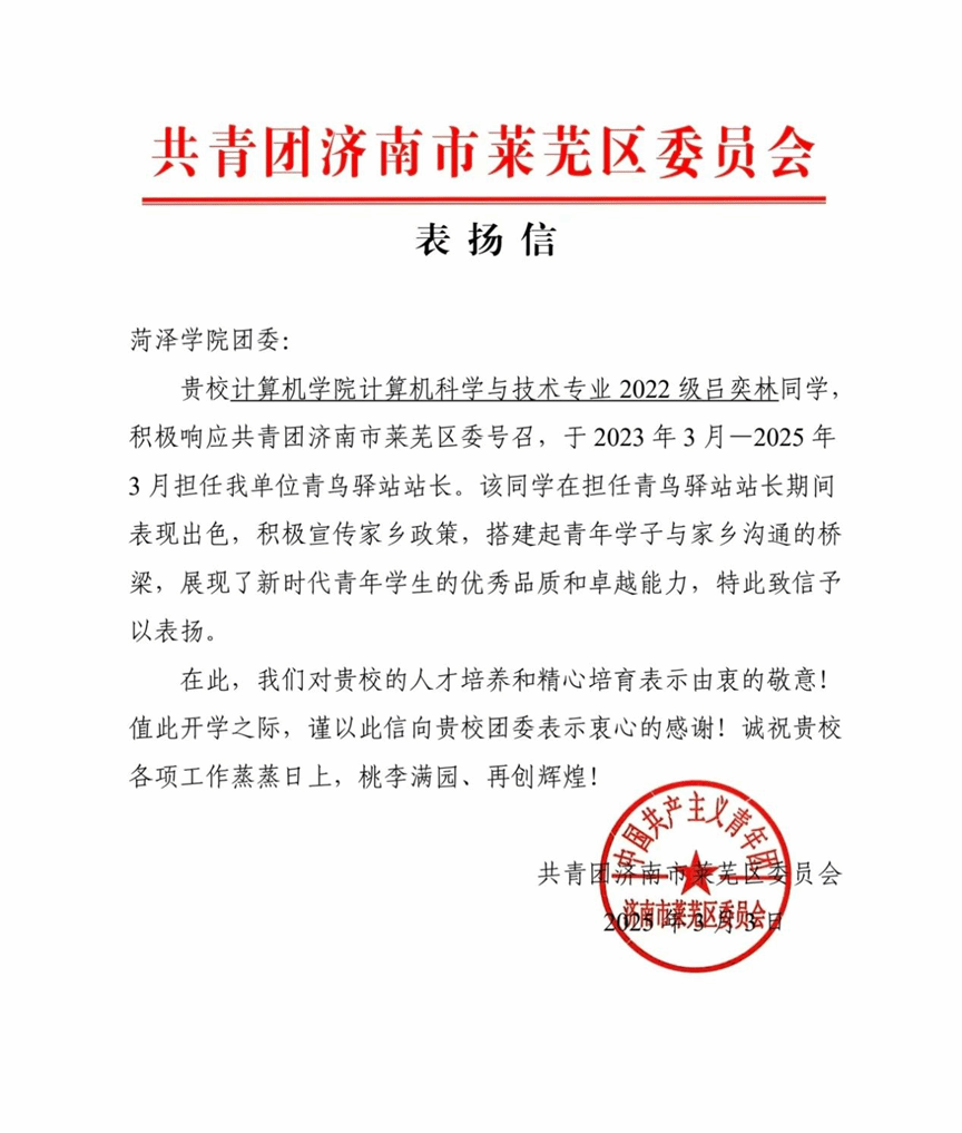 共青团济南市莱芜区委员会在表扬信中特别指出,吕奕林同学的工作表现突出,为家乡的青年工作做出了重要贡献。这不仅是对吕奕林同学个人的肯定,也是对伟德victor1946人才培养工作的认可。