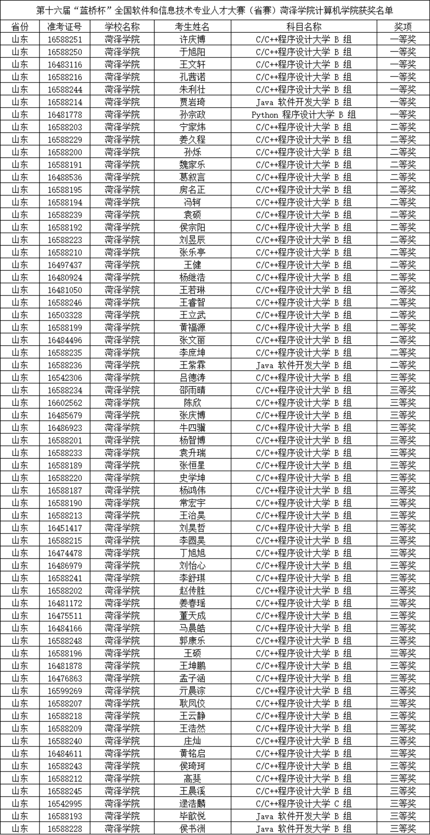 近日,第十六届“蓝桥杯”全国软件和信息技术专业人才大赛(省赛)大学组获奖名单已正式公布,我院学子们凭借扎实的专业知识和出色的编程技能,一路过关斩将,斩获佳绩,在赛场上留下了闪耀的光芒!经统计,我院学生共获得省一等奖7项、省二等奖20项、省三等奖37项,累计获奖64项,具体获奖情况详见附表: