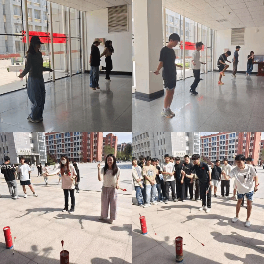 活动设置集体与个人项目,兼顾趣味与挑战。集体项目中,“乒乓球接力”需队员使用凹槽默契传递小球;“两人三足”考验搭档协作;“勇往直前”蒙眼转圈接力引发阵阵欢笑。个人项目涵盖定时跳绳、投壶、踢毽子及“摸石过河”等创意环节,学生各展风采。现场加油声此起彼伏,青春活力洋溢全场。