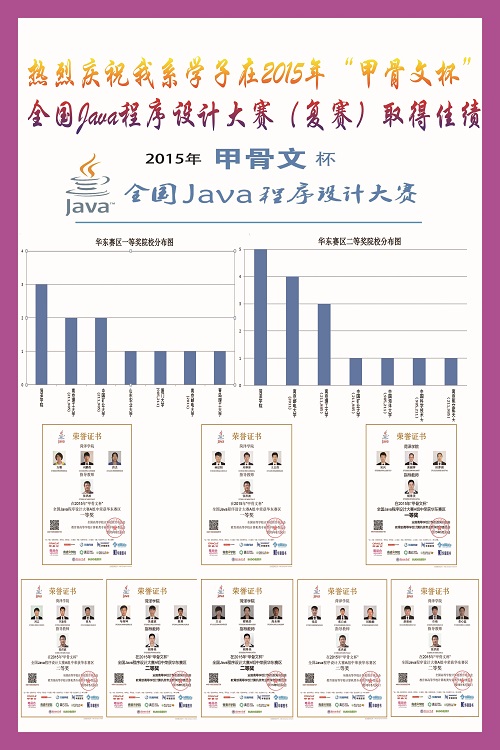 本报讯 (学通社 王祥宇)近日,由全国高校计算机教育研究会、教育部高校计算机类专业教学指导委员会主办的2015年“甲骨文杯”全国高校Java程序设计大赛(华东赛区)复赛在鲁东大学举行,我校计算机与信息工程系8支参赛队全部获奖,其中3支参赛队获一等奖,5支参赛队获二等奖,获奖队数居山东省参赛高校之首。