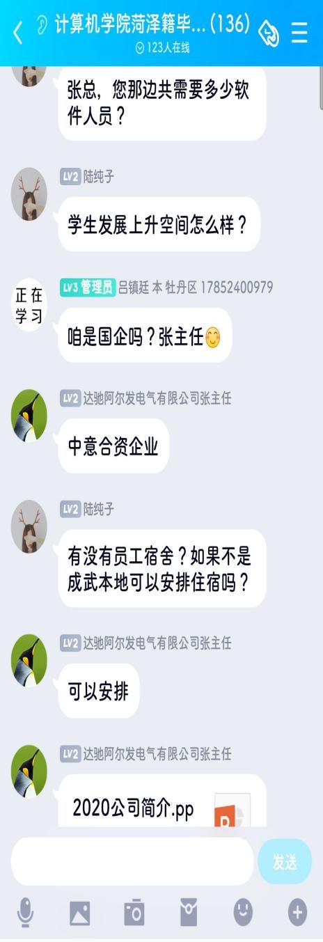 会上,成武达驰阿尔发公司、菏泽市大数据中心、菏泽伏羲智库、菏泽好品网络科技有限公司等知名企业分别宣讲了企业发展前景、岗位需求、工作性质、薪资待遇。毕业生也向用人单位进行了就业咨询,了解了企业用人情况,明确了今后工作方向。据悉,4家用人单位将为我院毕业生提供就业岗位31个。