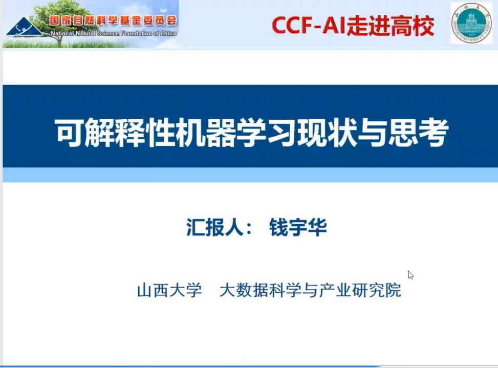 钱宇华教授以“机器学习可解释性研究现状与思考”为题,在总结归纳机器学习可解释性研究的基础上,汇报近年来针对该问题进行的一些尝试性探索,以期引起人工智能领域的一些学术思考与战略思考。