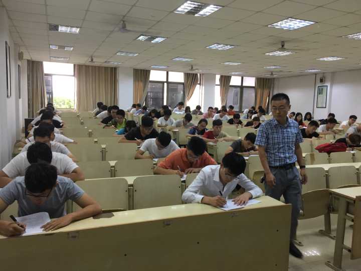 下午5点整,考试开始。考生将身份证及学生卡放置到课桌右上角,采取单人单桌的考试模式。教室只有考生翻动卷子的声音,为严肃考风考纪,加强考试管理,监考教师在教室前后走动,观察每一个考生的情况,并做好考场情况记录。考生沉着冷静地答题,不停在考卷上书写答案,每位考生都低头认真作答。下午6点整,考试结束,考生将笔放下,监考教师收卷。