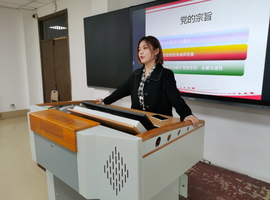 晚上7点整,入党积极分子专题培训正式开始。张艺通过播放PPT的形式从“党的宗旨”、“党的优良传统和作风”两大方面向入党积极分子阐述了关于“党的基本知识和党的历史”的主要内容。她向入党积极分子详细阐述了党员的标准,对同学们做出了要全面了解党史、端正入党动机的要求,并要求他们要坚持批评与自我批评,勇于反省,善于总结。同时她向入党积极分子普及党的纪律处分、权利和义务,表示希望学生在探索真理的道路上勇往直前,早日入党。