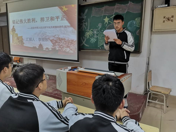 晚上7点整,论坛正式开始。首先,由计算机应用技术专业的孔龙带来以“勿忘国殇铭记历史,捍卫和平吾辈自强”为题的精彩演讲,演讲提出学生要学习先烈敢于斗争、勇于开拓的革命精神。视频“历史永不遗忘,致敬革命先驱”指明学生应铭记中国共产党曾取得的伟大胜利,不忘初心,居安思危。接着,计算机科学与技术(云计算与大数据)专业的李亚东通过播放PPT的形式向学生讲述了抗美援朝战争的历史背景及重要意义,促使学生进一步理解铭记我国革命历史的重要性。最后,主持人以“铭记伟大胜利,捍卫和平正义”为主题发起讨论,在座学生各抒己见,本次论坛到此结束。