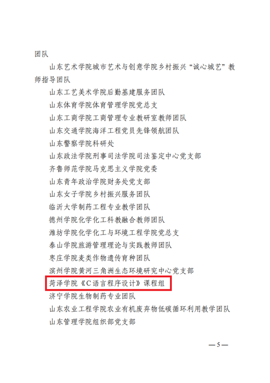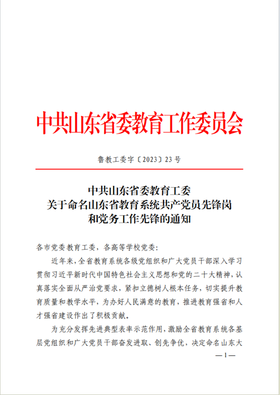 日前,中共山东省委教育工委印发《关于命名山东省教育系统共产党员先锋岗和党务工作先锋的通知》,《C语言程序设计》课程组被命名山东省教育系统共产党员先锋岗。