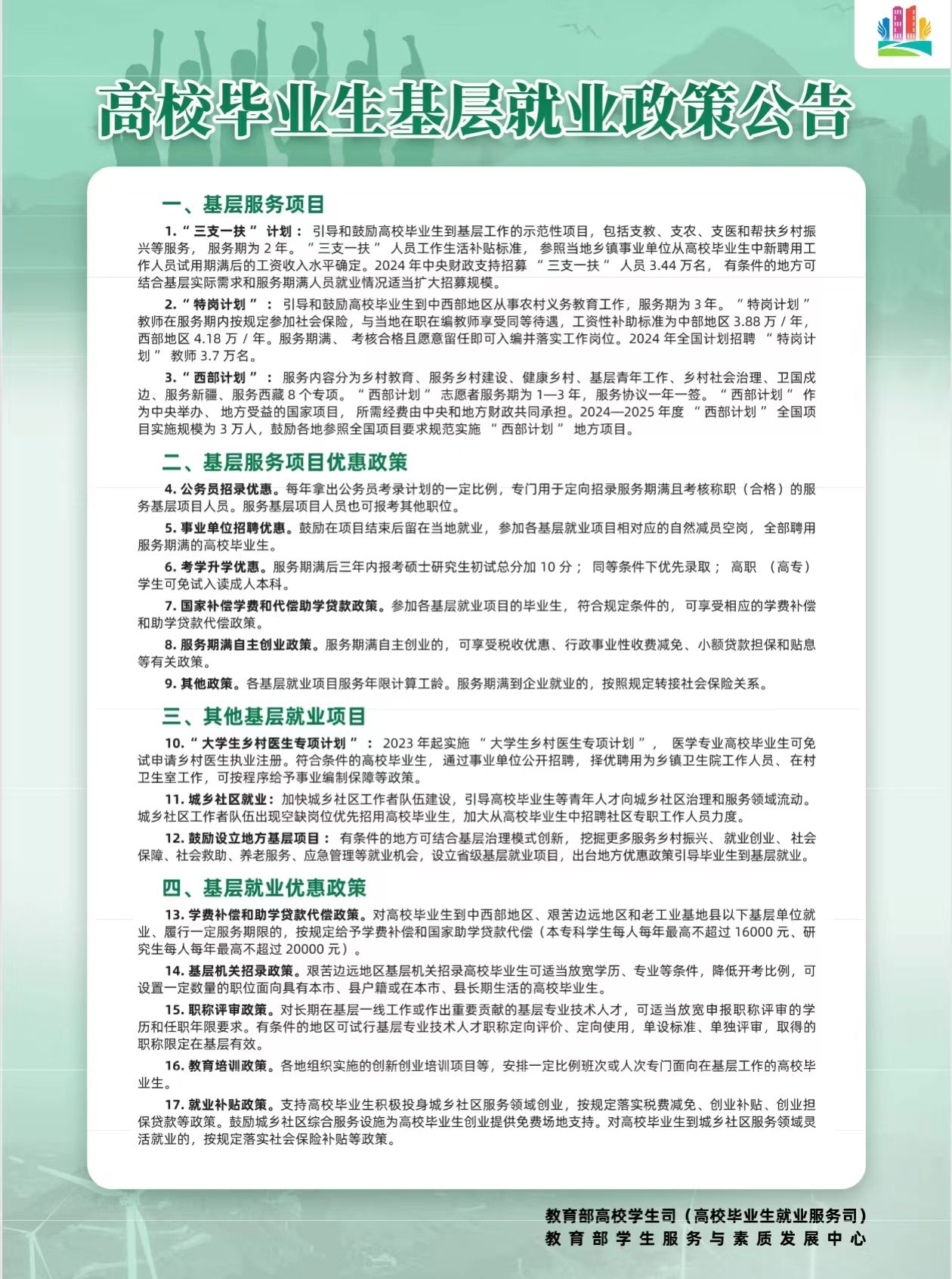 招生就业 招生工作 就业工作 相关政策 就业工作 网站首页 > 招生就业 > 就业工作 > 正文 普通高校毕业生基层就业政策公告 [作者]: [编辑]:伟德victor1946学工办   上一条:普通高校毕业生就业服务公告 下一条:高校毕业生等青年就业创业政策汇编