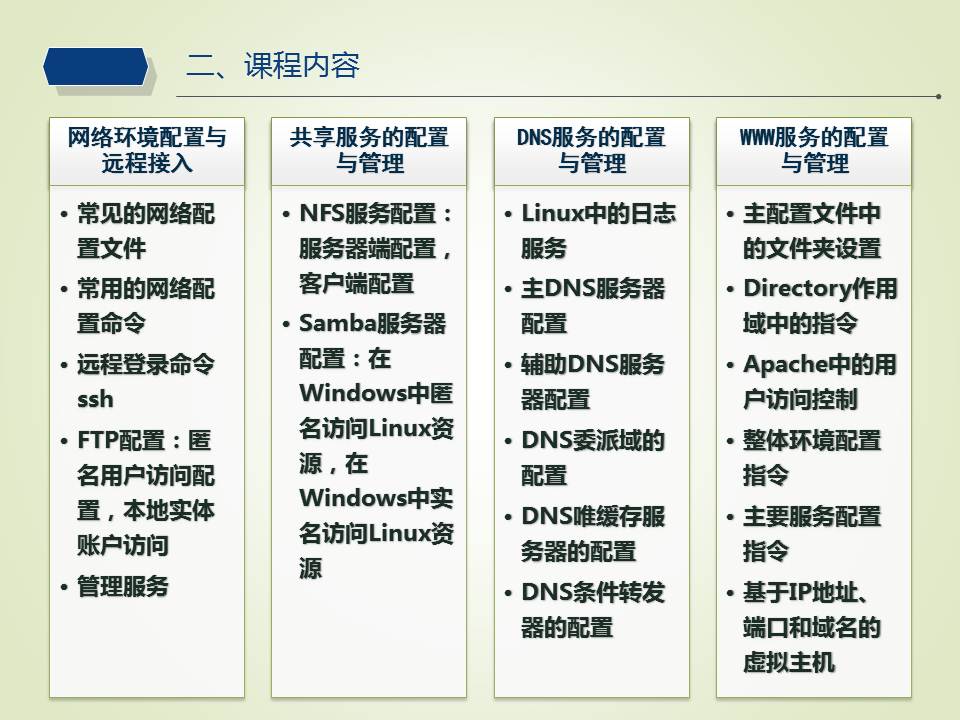教育教学 培养方案 课程建设 协同育人 教学成果 理论学习 课程简介 网站首页 > 教育教学 > 课程建设 > 课程简介 > 正文 Linux操作系统 [作者]: [编辑]:李静(计算机系)   上一条:python程序设计 下一条:Java Web程序设计