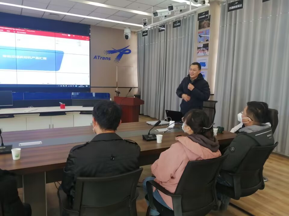 下午2点30分交流会正式开始。企业负责人介绍了智慧交通相关前沿科技产品;总经理祝肇忠对公司研发的城市交通信号控制系统方案进行了全方位的介绍。学院教师与企业科研人员就关注的相关问题,进行了深入讨论和交流。