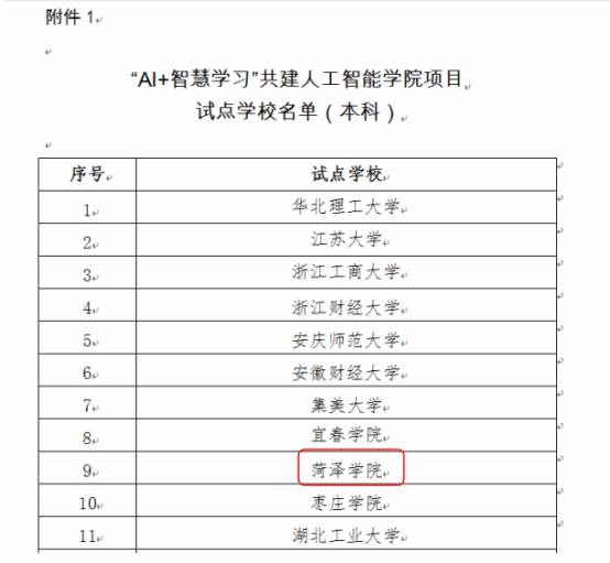 2018年7月24日,教育部学校规划建设发展中心下发《关于公布“AI+智慧学习”共建人工智能学院项目入选学校名单的通知》(教规建中心函〔2018〕56号),确定28所学校为“AI+智慧学习”共建人工智能学院项目试点学校,其中包含19所本科院校和9所高职院校,我校成功入选。