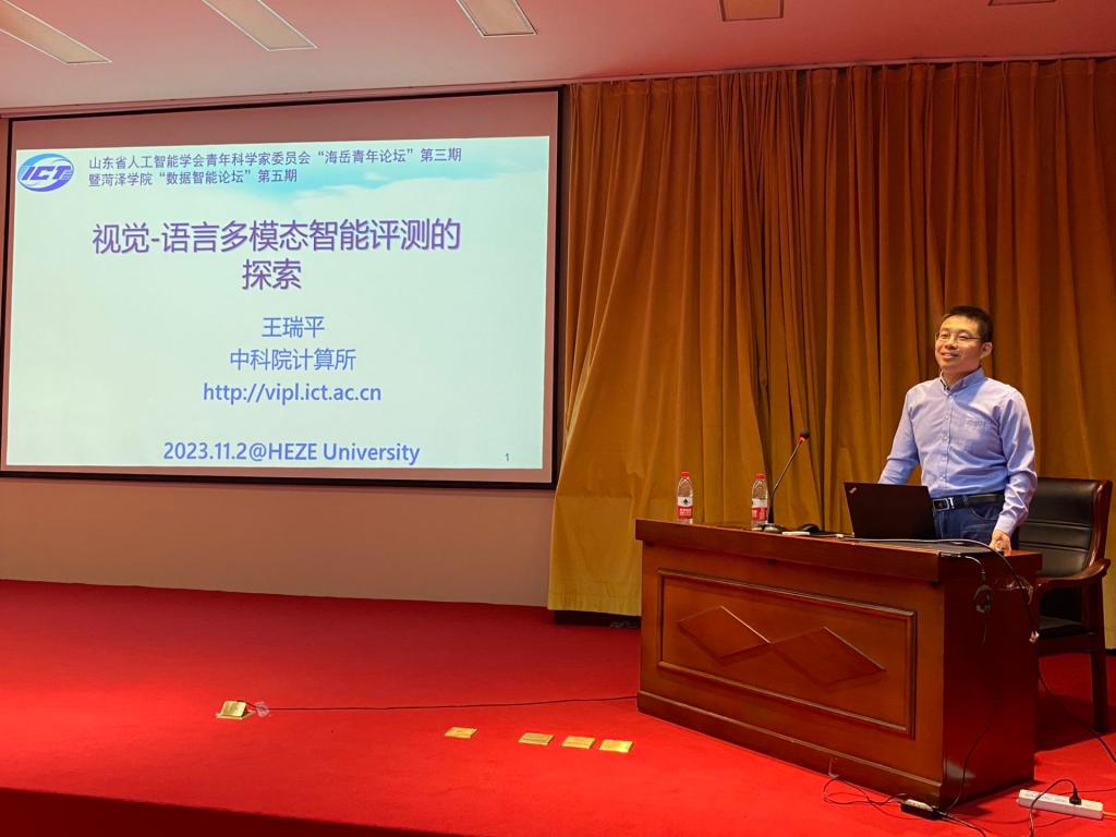 王瑞平教授的研究领域为计算机视觉与模式识别,重点关注真实开放环境下的视觉场景理解问题。在题为《视觉-语言多模态智能评测的探索》的报告中讲解了近年来物体识别、检测等视觉感知相关问题得到了较好的解决,面向视觉场景深度理解的视觉-语言多模态认知任务探索成为热点,并介绍了团队在多模态智能评测方面开展的初步探索及取得的一些具体进展。